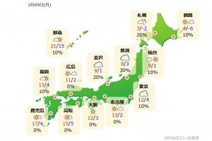 2026.3.9関東地方では3月9日夜から10日朝にかけて、雨や雪となる見込みです。上空に流れ込む寒気の影響で大気の状態が不安定となり、北関東では平野部でも雪が積もる可能性があります。9日朝には千葉県や茨城県の一部でアラレが観測されており、天気の急変にも注意が必要です。夜間から朝にかけては路面凍結や交通への影響が出る可能性もあります。積雪や凍結への対策を確認するとともに、水道管凍結など寒さによる生活トラブルにも備えておくことが大切です。